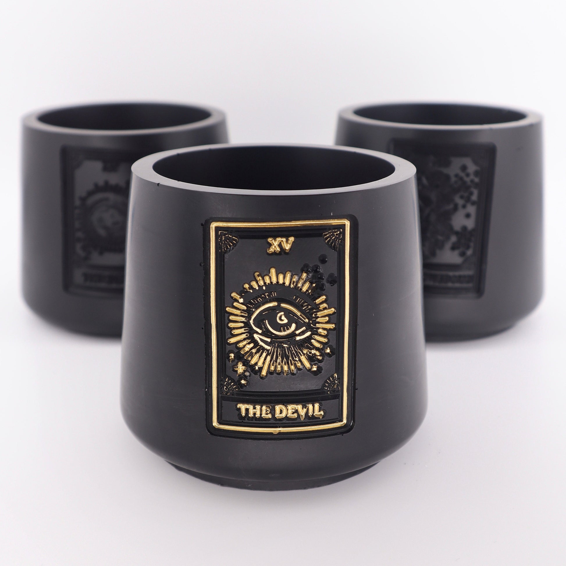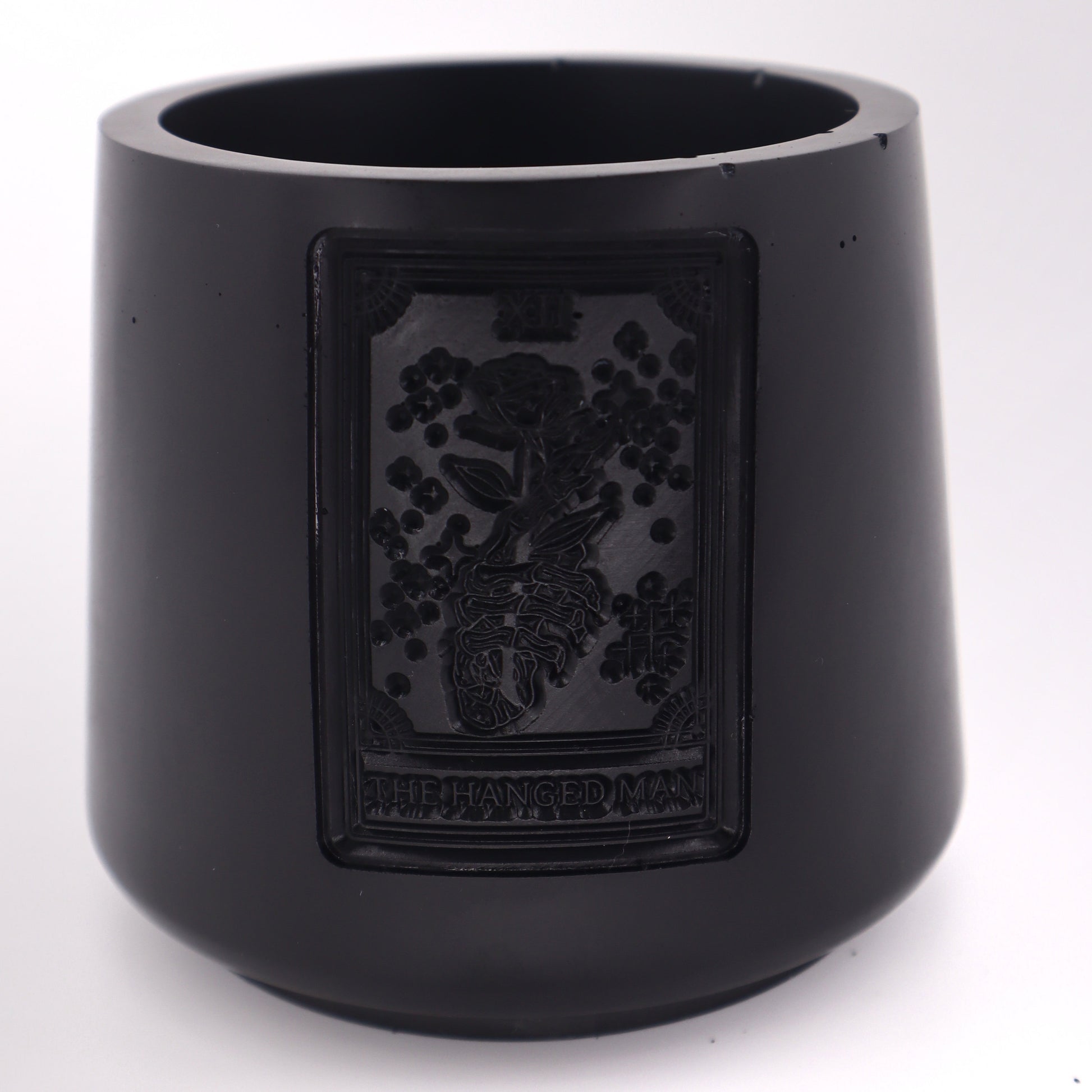 Enhance your plants with our artisanal black Jesmonite planter, showcasing a one-of-a-kind single tarot card design of your choosing. Splendidly infuse your living space with a sense of enchantment. This resilient and chic planter is offered in a sleek, all-black option or a sophisticated gold accent. Customize your surroundings with this versatile planter, perfect for both tarot aficionados and greenery enthusiasts.